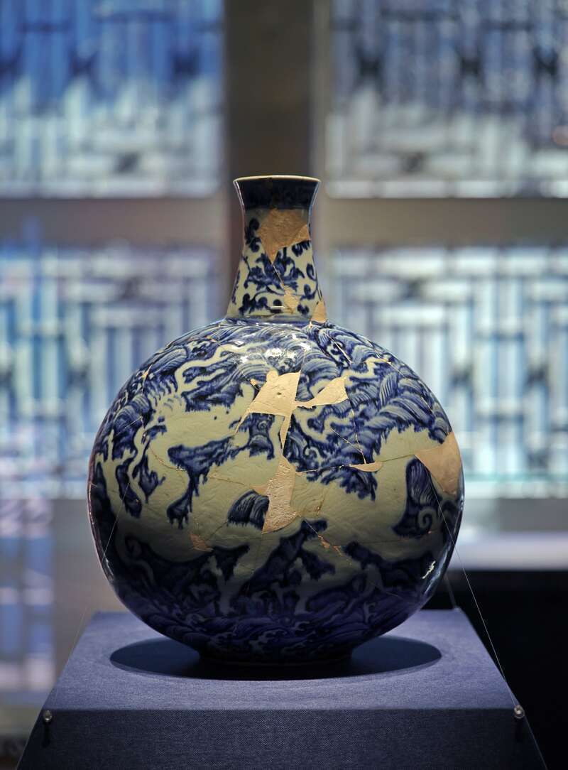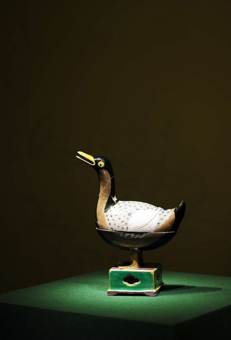 展品中,不仅有宣德青花蟋蟀罐、成化天字罐等明代御窑珍品,还有多件无传世品的修复件,如造型奇特的“成化青花凤穿花纹鹤颈瓶”,迄今发现的永乐朝御窑瓷器中器身最高的“甜白釉盘口兽耳长颈瓶”,以及景德镇御窑博物馆官方IP形象的原型“成化素三彩鸭形香薰”等。