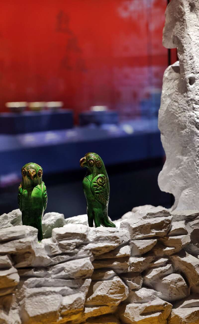 明清景德镇御窑出产的瓷器,亦多以吉祥纹样为装饰,是当时生活美学思想的重要体现。比如,位于展厅中央的“宣德青花鹦鹉折枝花果纹盘”,直径达72.3厘米,是不多见的御窑出品大器。盘心绘鹦鹉啄桃图,画意应取自唐代诗人杜甫《山寺》诗中“麝香眠石竹,鹦鹉啄金桃”一句,象征着生机勃勃、自在安乐的生活状态。鹦鹉音同“英武”,被古人视为瑞鸟,是广受喜爱的宠禽。配合此件展品,还展出了恭王府博物馆收藏的清道光年间绿釉鹦鹉一对。